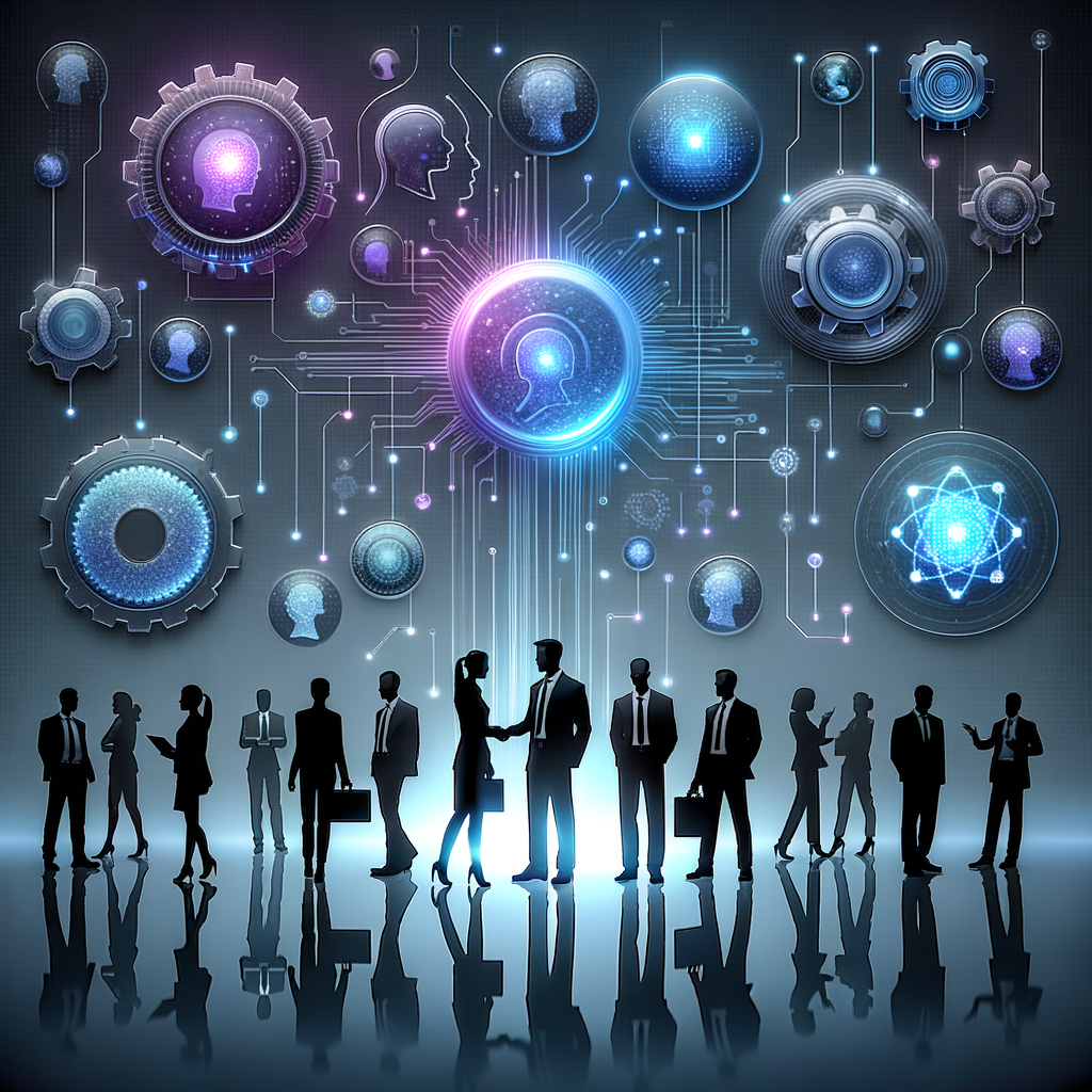 Representação abstrata de arquitetura tecnológica com redes interligadas e símbolos de colaboração humana em tons de azul e roxo, refletindo cultura organizacional e automação integrada.